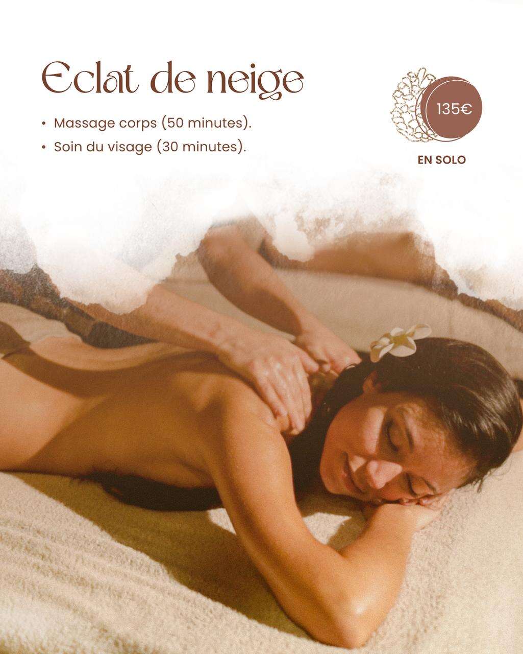 Une expérience sensorielle complète : 50 minutes de massage au choix pour une relaxation profonde, suivies d’un soin visage personnalisé de 30 minutes. Une symphonie de gestes doux et précis pour détendre, hydrater et illuminer.