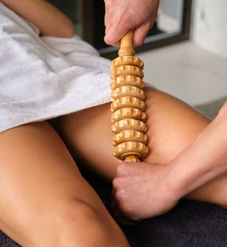 Technique manuelle naturelle de massage accessoirisémassage anti-cellulite avec accessoires en bois exotique. Association de manoeuvres décontractantes et drainantes et l'utilisation de rouleaux, cloches, planches... en bois tropical pour OPTIMISER LE LISSAGE DE LA PEAU, AMELIORER SON ASPECT VISUEL, ATTENUER L' ASPECT PEAU D'ORANGE, REGALBER et REDESSINER LES FESSES, CUISSES, HANCHES, VENTRE...