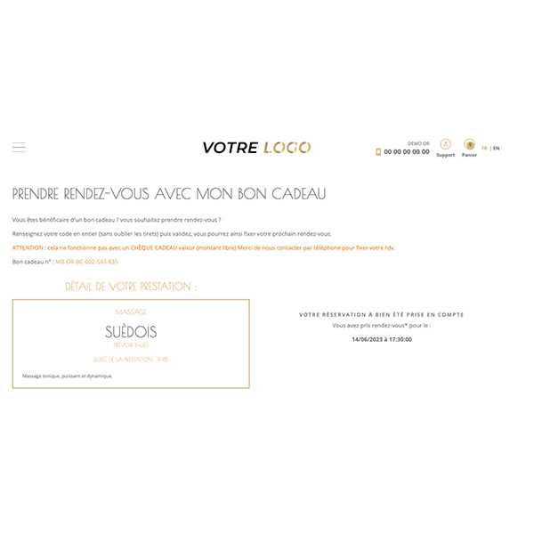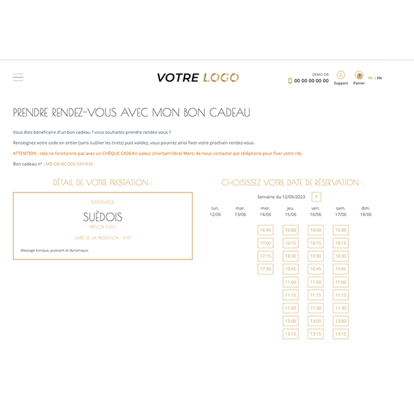 ÉTAPE 2 : La prestation offerte apparaît, le client doit sélectionner le jour et l'heure de son rendez-vous selon les créneaux disponibles.